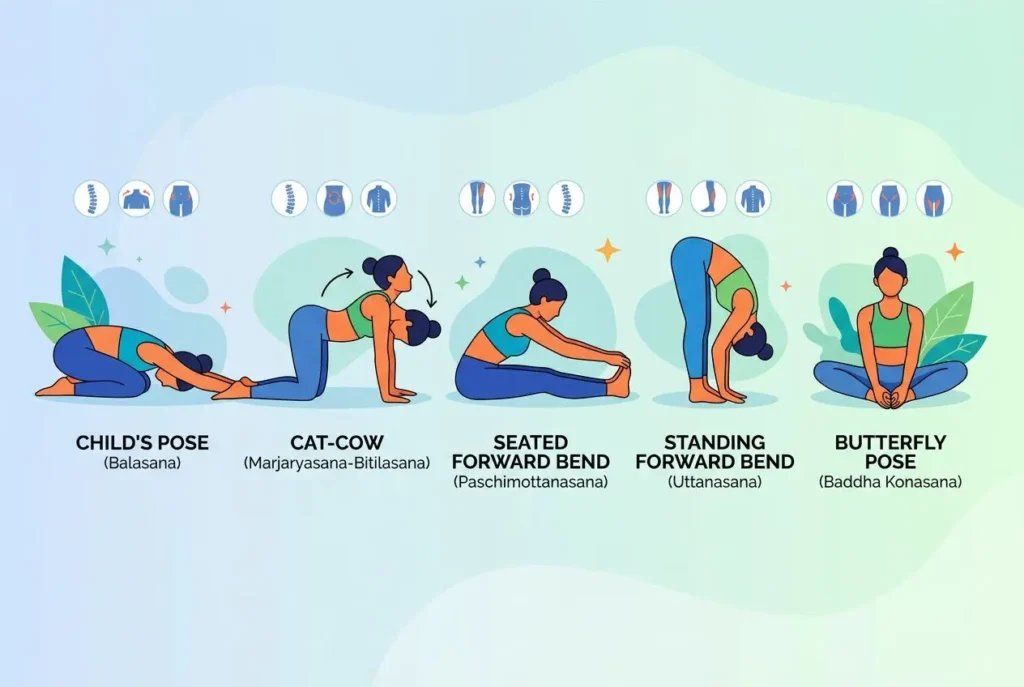 The knee-to-chest pose gently releases the lower back and suits all experience levels. Using yoga blocks and straps supports proper alignment during stretching exercises. These simple tools reduce strain and allow you to comfortably hold deeper stretches in any pose.