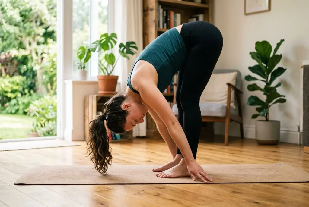 - Forward Bend: Fold at your hips with soft knees, allowing your head to hang. Gentle rocking for 20 seconds safely extends your spine and hamstring.
