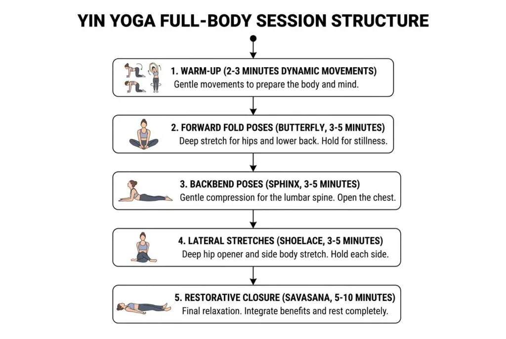 A yin yoga full body stretch uses sustained holds of three to five minutes to target your fascia, ligaments, and joints. This mindful approach builds lasting flexibility through progressive tissue lengthening. Programs like Yin yoga teacher training emphasize how deep flexibility training engages the parasympathetic nervous system to reduce stress.