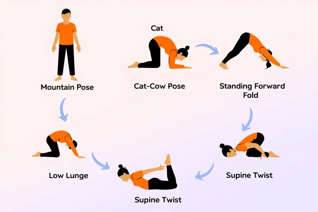- Warm-up phase (5–10 minutes): Flow through Cat-Cow stretches for one to two minutes, gently mobilizing your spine and coordinating each stretch with deep, conscious breathing.